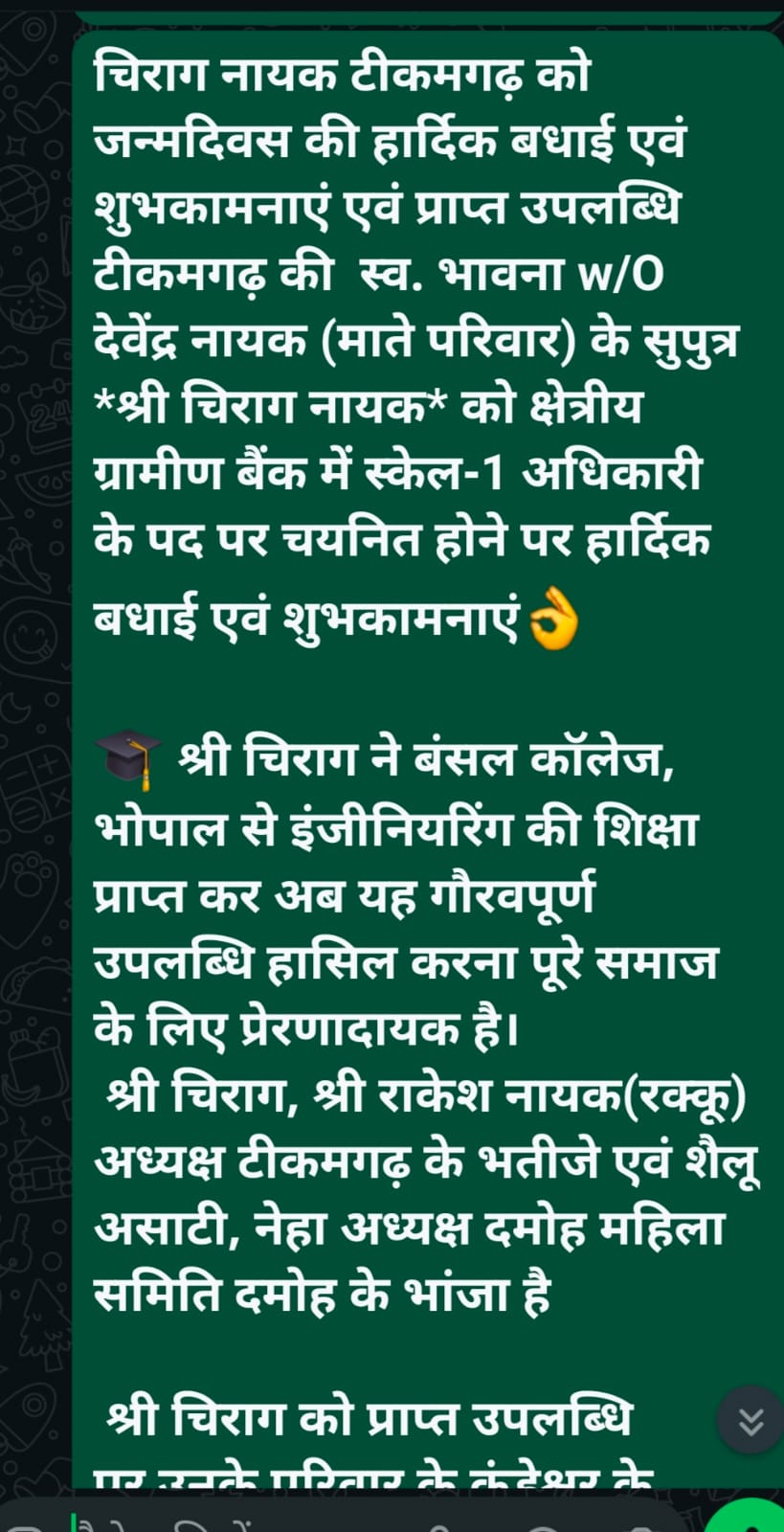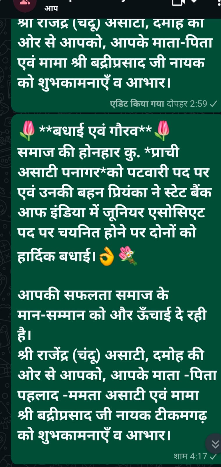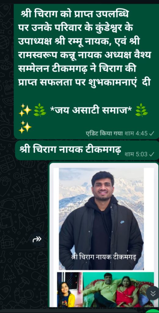 अखिल भारतीय असाटी समाज महासभा के अध्यक्ष आदरणीय श्री वीरेन्द्र असाटी जी एवं अन्य समाज सेवियों द्वारा एमपीपीएससी 2022 में चयनित कु.सौम्या असाटी (Assistant Director Education)को बकस्वाहा पहुंचकर बधाई एवं शुभकामनाएं प्रस्तुत की गईं।