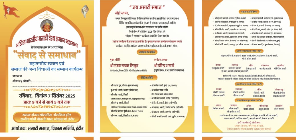संवाद से समाधान – इंदौर अखिल भारतीय असाटी वैश्य समाज महासभा के के तत्वाधान में असाटी समाज विकास समिति इंदौर द्वारा आयोजित संवाद से समाधान कार्यक्रम ऐतिहासिक और सराहनीय रहामुख्य आकर्षण मुख्य अतिथि संजय नायक जी अध्यक्षता राष्ट्रीय अध्यक्ष वीरेंद्र असाटी जी विशिष्ट अतिथि एक दर्जन से अधिक समाजसेवी संचालन श्रीमती नीतू राजकुमार असाटी* एवं डॉ. विशाल असाटी महामंत्री कृति असाटी द्वारा भगवान राम स्तुति पर आकर्षक कत्थक नृत्य