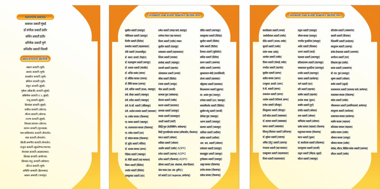 असाटी समाज विकास समिति इंदौर द्वारा अतिथियों का सम्मान संरक्षक ठेकेदार के.सी. असाटी, अशोक नायक, पूर्व कमिश्नर, डॉक्टर एच.एन. नायक, के.पी. असाटी, डॉ. अनिल असाटी, अध्यक्ष राजकुमार असाटी, उपाध्यक्ष भरतलाल असाटी, ओमप्रकाश असाटी, डॉ. भरत असाटी, सचिव शैलेंद्र असाटी, कोषाध्यक्ष कमलेश नायक, सह सचिव ग्रीस असाटी, कार्यकारिणी सदस्य राजेश गणेश असाटी, आनंद असाटी, स्वप्निल असाटी, नीलेश असाटी, उमेश असाटी, मीडिया प्रभारी महिला समिति इंदौररू अध्यक्ष प्रियंका भारत असाटी, उपाध्यक्ष संगीता शैलेंद्र असाटी, सचिव स्वाति नितिन असाटी, कोषाध्यक्ष संगीता कमलेश नायक युवा समिति इंदौररूअध्यक्ष नितिन असाटी, उपाध्यक्ष उमेश असाटी, डॉ. सुनील असाटी, सचिव प्रमोद असाटी, कोषाध्यक्ष अतुल असाटी, सह सचिव सौरभ असाटी, कार्यकारिणी सदस्य प्रभात नायक, कौस्तुभ असाटी, पवन असाटी, आदर्श असाटी, देवांश असाटी