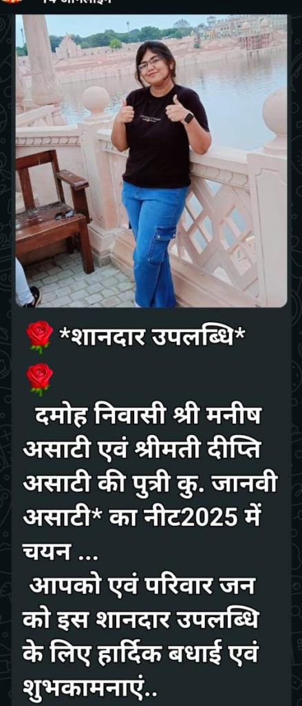 अखिल भारतीय असाटी समाज महासभा के अध्यक्ष आदरणीय श्री वीरेन्द्र असाटी जी एवं अन्य समाज सेवियों द्वारा एमपीपीएससी 2022 में चयनित कु.सौम्या असाटी (Assistant Director Education)को बकस्वाहा पहुंचकर बधाई एवं शुभकामनाएं प्रस्तुत की गईं।