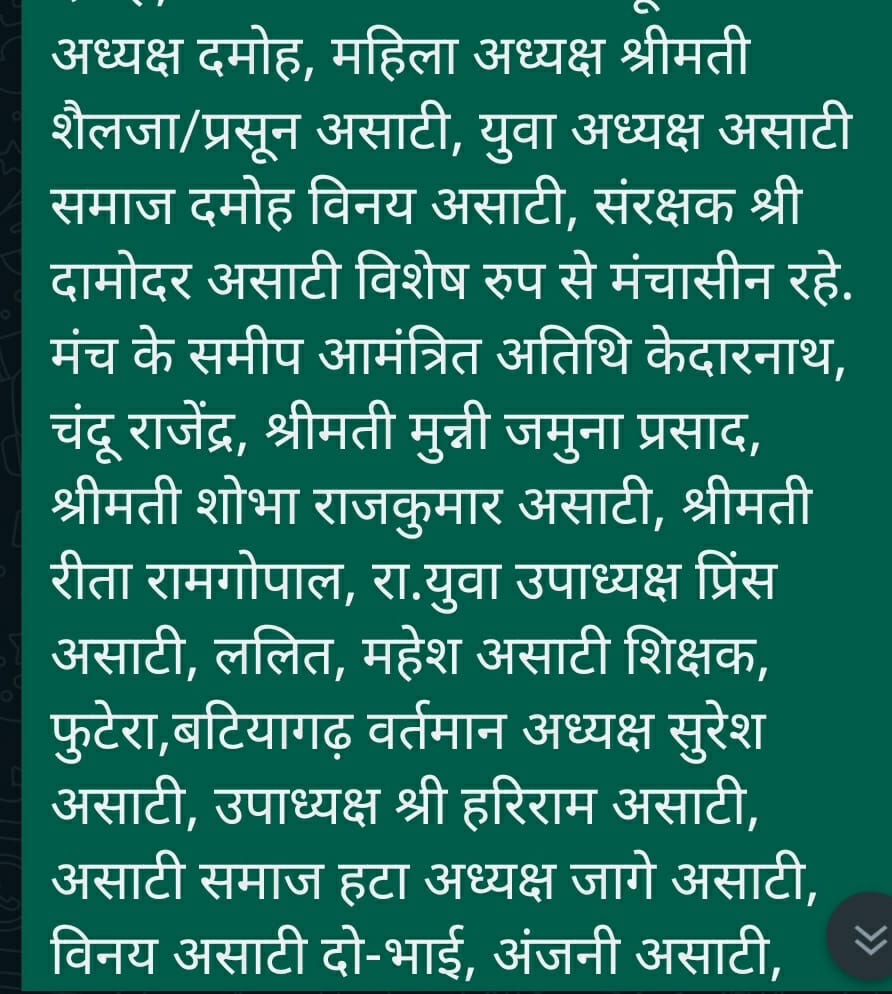 बटियागढ़ में आयोजित समाज मिलन एवं बुजुर्गों छात्राओं के सम्मान एवं युवा महिला वरिष्ठ समिति के पुनर्गठन असाटी समाज युवा मंडल ने किया फल वितरित कार्यक्रम /असाटी समाज दमोह द्वारा बांदकपुर भोलेनाथ के मंदिर के सामने ठंडा शीतल पेयजल की पहल शुरू /दमोह महिला समिति द्वारा तीन दिवसीय समर कैंप का आयोजन