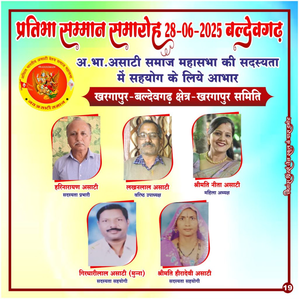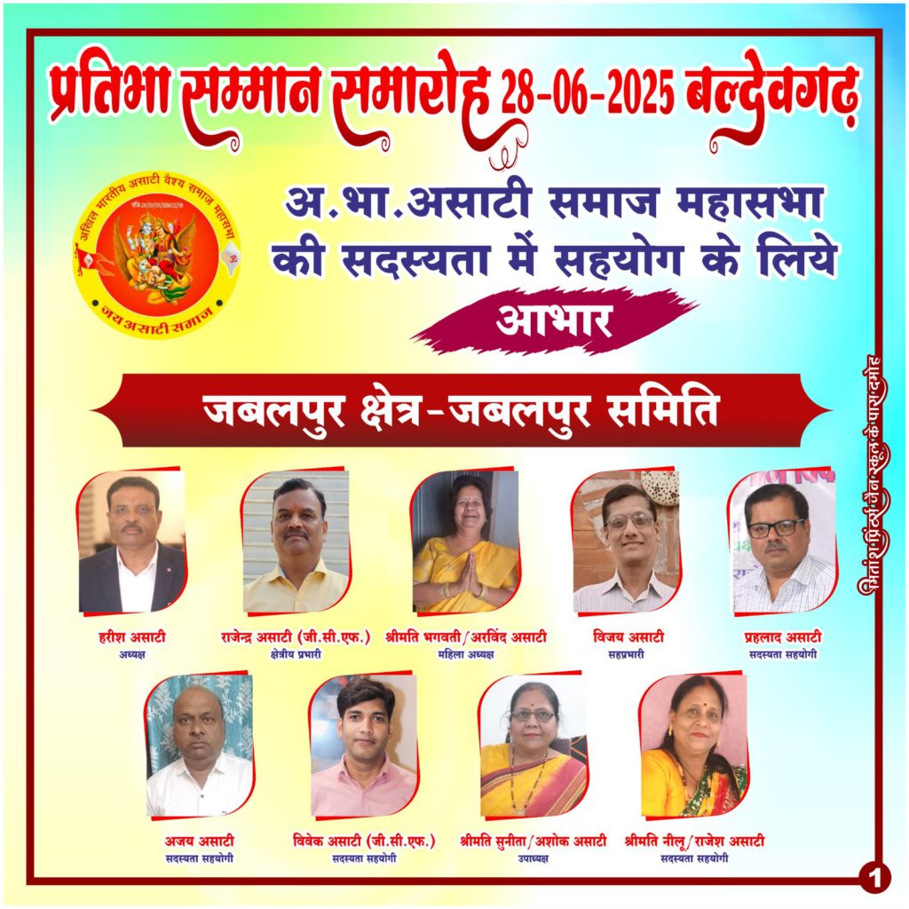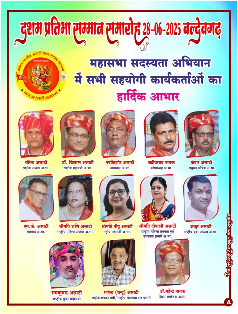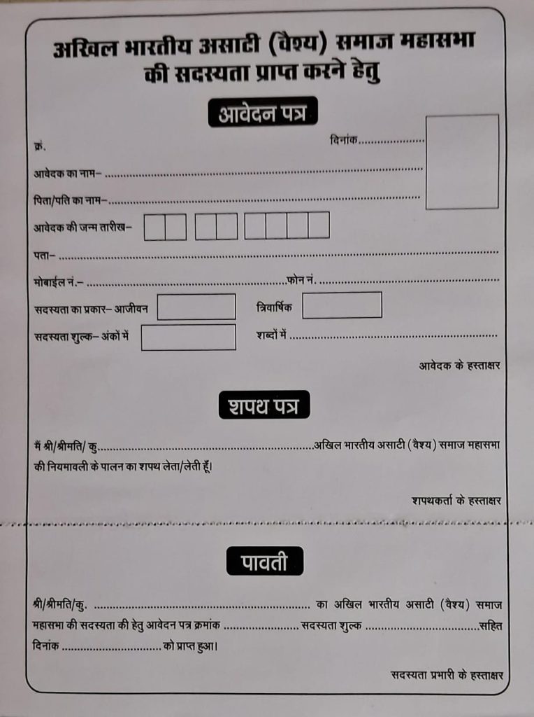 ’’अखिल भारतीय असाटी वैश्य समाज महासभा’’ एक रजिस्टर्ड संस्था है, जो हमारे समाज की प्रगति, एकता और सशक्तिकरण के लिए निरंतर कार्यरत है। आज हम आप सभी से आग्रह करते हैं कि महासभा की ’सदस्यता’ लें और समाज को और अधिक संगठित एवं सशक्त बनाने में भागीदार बनें।