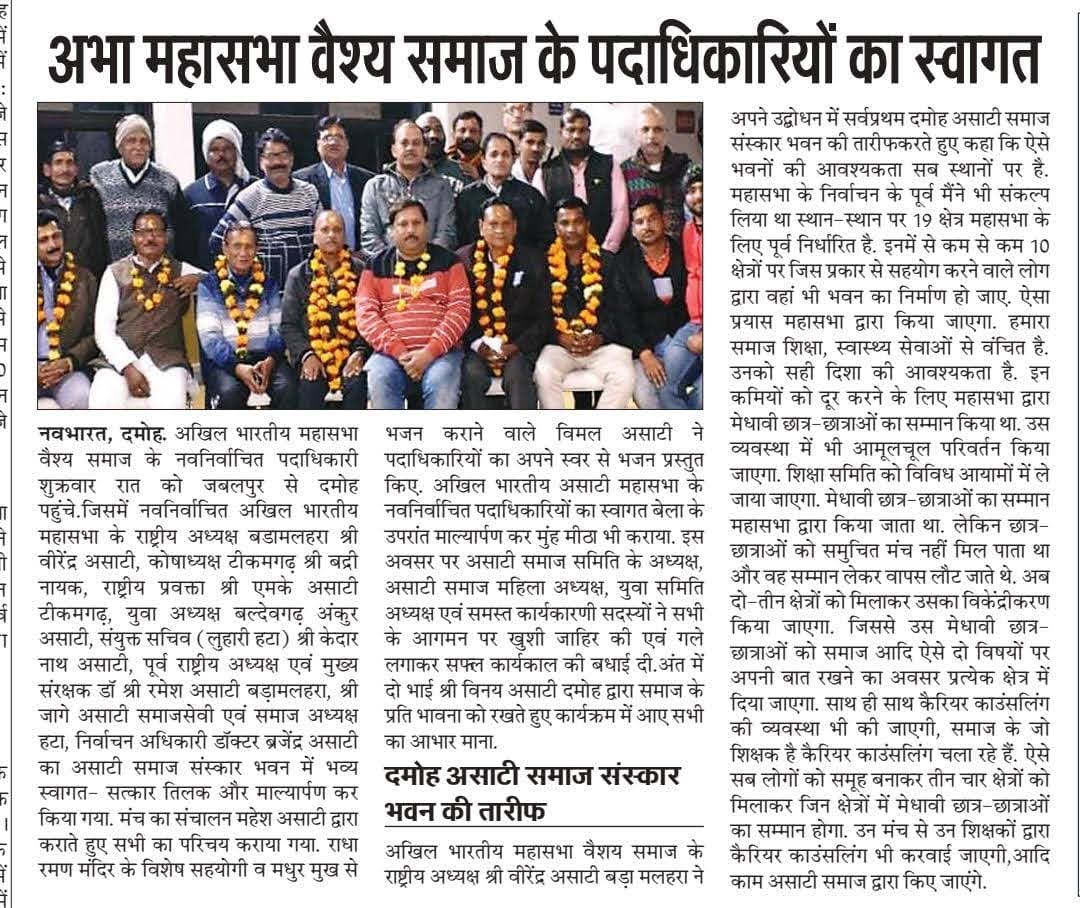 महासभा की विगत 5 माह की सामाजिक गतिविधियों का विवरण / दिनांक 25 अप्रैल 2022 को असाटी समाज भवन कमल कुंज तिरोड़ा में अखिल भारतीय असाटी समाज महासभा की प्रथम एवं महत्वपूर्ण बैठक राष्ट्रीय अध्यक्ष श्री वीरेंद्र असाटी की अध्यक्षता मे निम्न विषयों पर आयोजित हुई उपस्थित गणमान्य पदाधिकारीयों एवं सदस्यों ने अपने विचार रखें. परम श्रद्धेय स्व श्री अमृतलाल असाटी जी की प्रथम पुण्यतिथि पर उनकी पावन स्मृति में उनके सुपुत्रों श्री दिलीप असाटी जी, बंशी असाटी जी एवं समस्त परिवार द्वारा "श्रद्धांजलि कार्यक्रम" आयोजित किया गया। कार्यक्रम की झलकियां असाटी वैश्य परिचय यूट्यूब चैनल की निम्न लिंक से देखें https://youtu.be/ABDvKa66T5E १. "प्रवास" के १२ बिंदुओं पर चर्चा २. शिक्षा प्रकोष्ठ एवं मेधावी छात्र छात्राओं के सम्मान पर चर्चा ३. अविवाहित युवक युवतियों के विवाह संबंध/परिचय सम्मेलन आज की अनिवार्य आवश्यकता? पर चर्चा ४. ग्राम/नगर/क्षेत्रीय समितियाँ एवं महासभा के संबंध समन्वय पर चर्चा ५. अध्यक्षजी की अनुमति से अन्य बिंदुओं पर चर्चा 2 - दिनांक 26 अप्रैल 22 को गोंदिया क्षेत्र के तिरोड़ा, मुंडीकोटा ,गोंदिया, आमगांव कांटी, बालाघाट, लामता मैं महासभा द्वारा प्रवास कर स्थानीय समितियों से परिचय एवं सामाजिक विषयों पर चर्चा की गई 5- बालाघाट में पिछड़ा वर्ग आयोग के अध्यक्ष आदरणीय श्री गौरीशंकर बिसेन जी से महासभा एवं बालाघाट समिति द्वारा समाज को पिछड़ा वर्ग में लाने के लिए बहुत विस्तार से चर्चा हुई