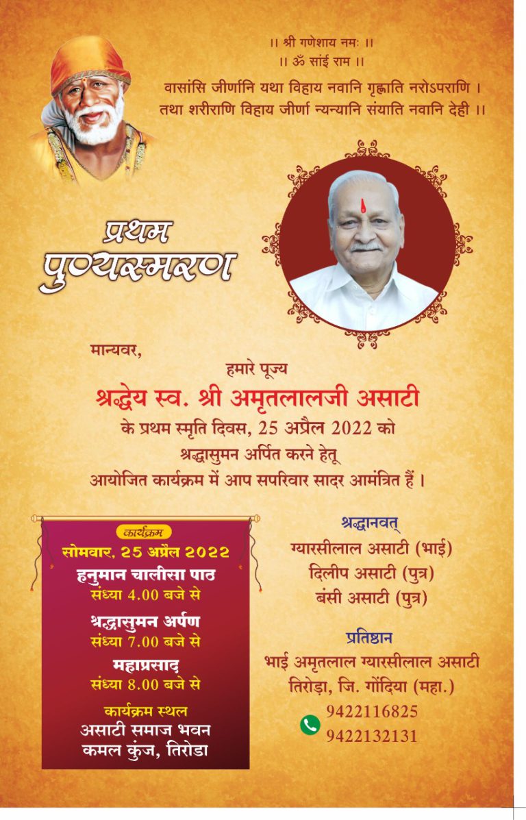 अखिल भारतीय असाटी महासभा की प्रथम कार्यकारिणी बैठक/परम श्रद्धेय स्व श्री अमृतलाल असाटी जी की प्रथम पुण्यतिथि पर श्रद्धांजलि कार्यक्रम/ गोंदिया क्षेत्र एवं बालाघाट क्षेत्र का दौरा