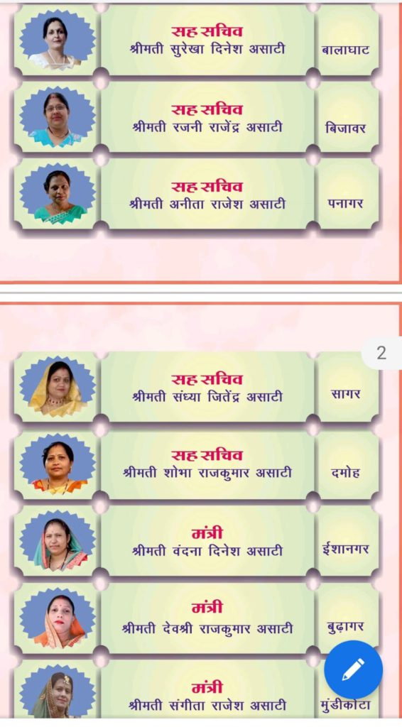 राष्ट्रीय महिला समिति ने अपना विस्तार कर नए पदाधिकारियों को मनोनीत किया है. सभी मनोनीत पदाधिकारियों को हार्दिक बधाई एवं अभिनन्दन... 🌹🌹 आप अपने सामाजिक अनुभव, कौशल और संपर्क से अपने दायित्व का पूर्ण कर्तव्यपरायणता से निर्वहन करे ऐसी हम सभी आपसे अपेक्षा करते है. शुभकामनाओ सहित.. शशि असाटी राष्ट्रीय महिला अध्यक्ष दीपाली असाटी राष्ट्रीय महिला प्रवक्ता राष्ट्रीय अध्यक्ष महोदय द्वारा मेधावी छात्र छात्राओं के सम्मान के साथ साथ शिक्षा के विभिन्न आयामों जैसे, काउंसलिंग, कोचिंग, मोटिवेशन, ट्रेनिंग, स्कॉलरशिप, इत्यादि पर कार्य करने समिति की घोषणा की जा रही है, जो समय समय पर महासभा के साथ समन्वय करते हुए समाज हित में कार्ययोजना बनाकर समाज के सभी छात्र छात्राओं को लाभ पहुचाने का प्रयास करेगी। अखिल भारतीय असाटी महासभा महासभा द्वारा संरक्षक,मार्गदर्शक एवं क्षेत्रीय उपाध्यक्षों का मनोनयन किया जा रहा है,जिसकी सूची जारी की जा रही है। अखिल भारतीय असाटी वैश्य समाज महासभा आप सभी को हार्दिक बधाई देती है और उम्मीद करती है कि आपकी निरंतर सक्रियता एवं कुशल मार्गदर्शन में समाज हितैषी कार्य निरंतर जारी रहेंगे। नोट :1/ कटनी क्षेत्र,हीरापुर शाहगढ़ क्षेत्र,इंदौर क्षेत्र,खुरई बीना क्षेत्र से मार्गदर्शकों की नियुक्ति शीघ्र ही की जाएगी। 2 / जबलपुर क्षेत्र,दमोह क्षेत्र,सागर बंडा क्षेत्र,बिजावर सटई क्षेत्र,खुरई बीना क्षेत्र,घुवारा बड़ागांव क्षेत्र एवं अन्य क्षेत्र से क्षेत्रीय उपाध्यक्षों का मनोनयन शीघ्र ही किया जाएगा जय असाटी समाज डॉ विशाल असाटी महामंत्री अखिल भारतीय असाटी वैश्य समाज महासभा
