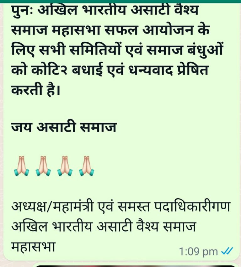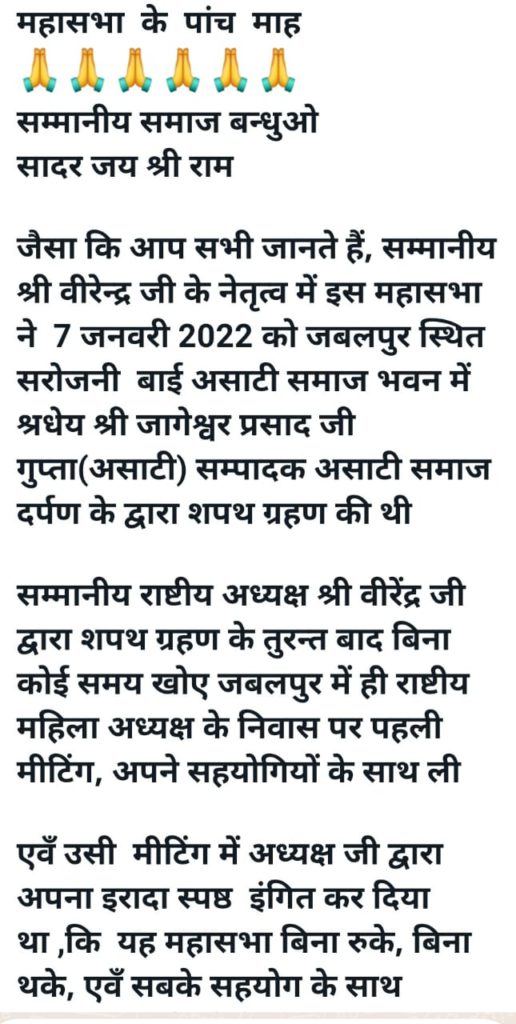 महासभा की विगत 5 माह की सामाजिक गतिविधियों का विवरण/अखिल भारतीय असाटी समाज महासभा के मनोनीत पदाधिकारियों की एक जाई सूची,विभिन्न प्रकोष्ठ, प्रवास गतिविधियों का अपडेट 👇