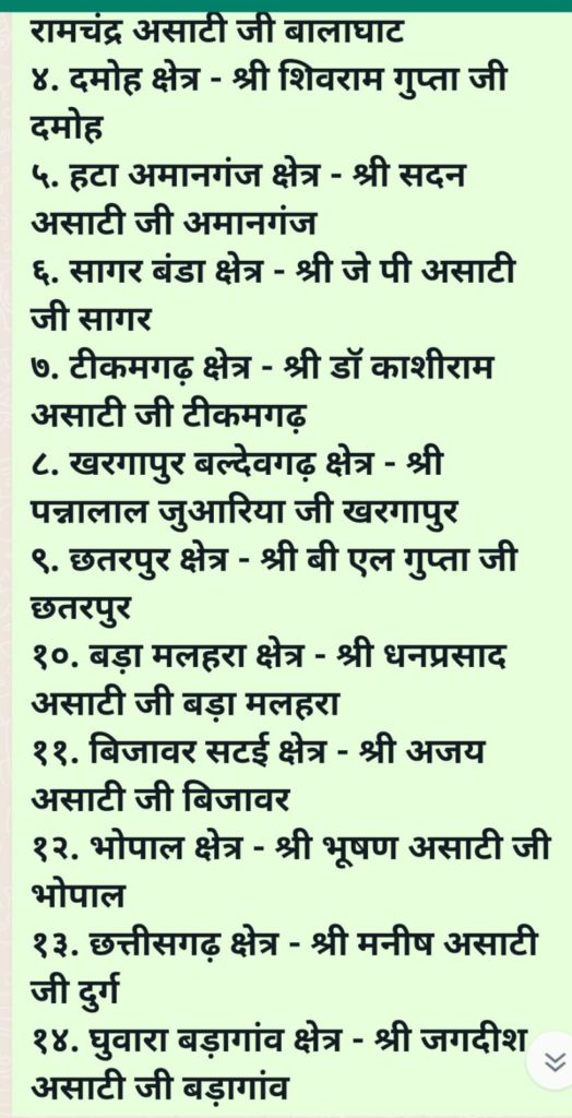 देशभर से आए प्रतिनिधिरू राजेश असाटी (टीकमगढ़), रमेश असाटी (छतरपुर), धन प्रसाद असाटी (बड़ा मलहरा), कमलेश असाटी (पूर्व उपाध्यक्ष), रामकुमार असाटी (पूर्व अध्यक्ष), ओमप्रकाश असाटी (भगवा), काशी प्रसाद असाटी (रामनामी), संजय असाटी (घुवारा), जगदीश असाटी (बड़ागांव), नंदकिशोर असाटी (महाराष्ट्र), मोदी असाटी (सिवनी), चंदू असाटी , विनय असाटी, (पत्रकार), विनय असाटी, (दो भाई) आलोक असाटी (पूर्व अध्यक्ष), वीरेंद्र असाटी (वर्तमान अध्यक्ष), महेश असाटी (दमोह), रविशंकर असाटी (बटियागढ़), रामकुमार असाटी (हटा), केदार असाटी (महासभा लुहारी)