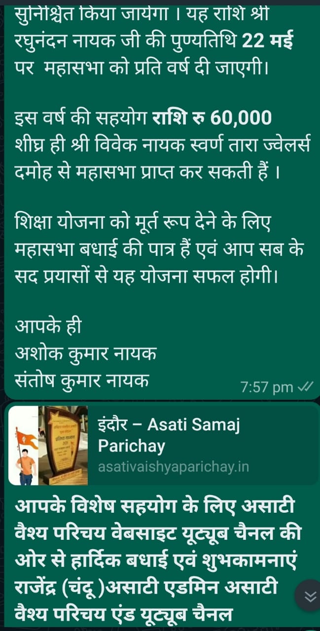 श्री खजराना गणेश असाटी फाउंडेशन द्वारा ई-रिक्शा गणेश दर्शन की निशुल्क सेवा प्रारंभ की//पूज्य पिताजी श्री रघुनंदन नायक जी की पुण्य स्मृति में अशोक कुमार नायक (रिटायर्ड एडीशनल कमिश्नर) इंदौर एवं संतोष कुमार नायक सराफ दमोह द्वारा महासभा के संकल्पित "जरूरतमंद मेधावी छात्र/छात्राओं की आर्थिक सहायता हेतु योजना" में प्रति वर्ष ₹60000/- देने का संकल्प/इंदौर में तीनों समिति का गठन/महिला दिवस/होली मिलन की झलकियां