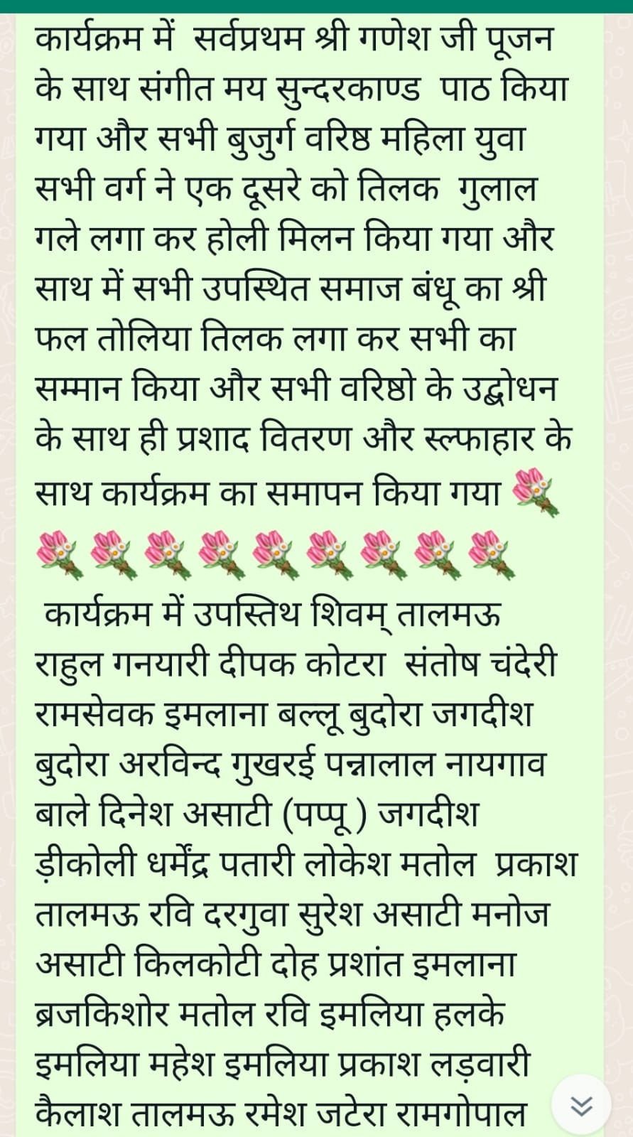 अभी तक इस योजना को समाज का भरपूर ज्वारिया परिवार के द्वारा मंदिर का नवीनीकरण बहुत ही सुंदर भव्यता के साथ किया गया इसी उपलक्ष्य में गर्भ ग्रह में भगवान श्री बिहारी जी सरकार का पुनः विराजमान विधि विधान के साथ किया गया इसके बाद 12:00 से 5:00 तक सुंदरकांड का पाठ किया गया शाम 5:00 बजे से नगर समाज बंधुओ के मार्गदर्शन में होली मिलन का कार्यक्रम किया गया इसी दौरान ज्वारियां परिवार के द्वारा नगर के वरिष्ठ समाज बंधुओ का शाल श्रीफल फूल माला पहनाकर सम्मान किया गया एवं नगर की वरिष्ठ समिति महिला समिति युवा समिति का भी सम्मान साल श्रीफल से किया गया कार्यक्रम पश्चात प्रसाद वितरण किया गया